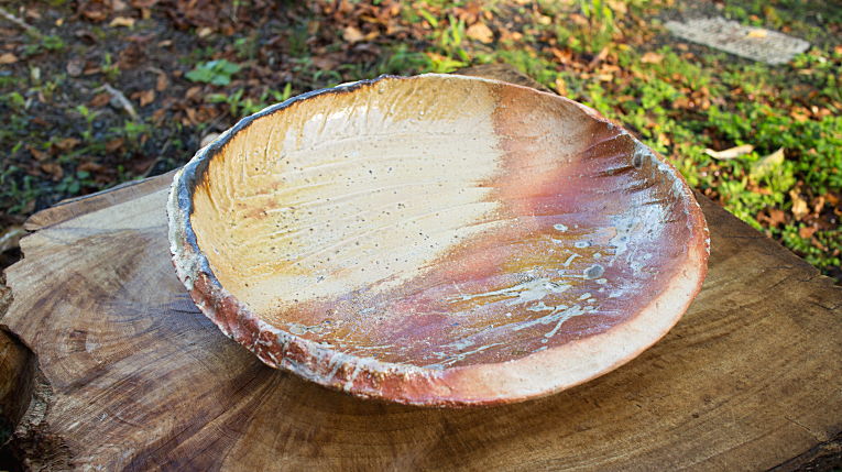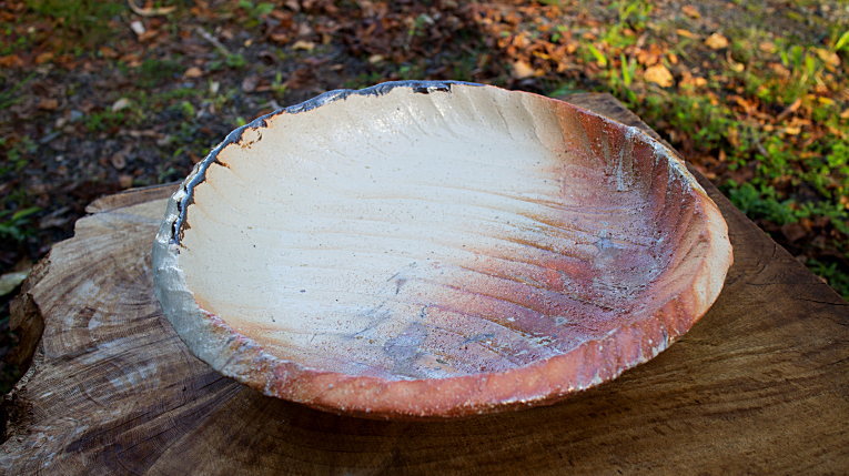 ハマグリの貝殻をぎゅぅと押し付けて模様を付けています。口縁の分厚いのを作るのが得意ですが、師匠「古谷信男」のところで学んだ技が生きています。左上部は「柞灰透明釉」をたっぷりスプレー掛けしています。少々たわんでるのは、焼成の時の変化でいいもんですね。