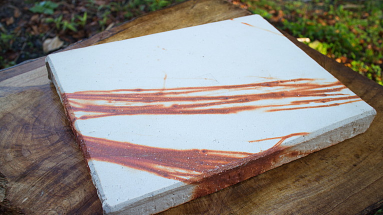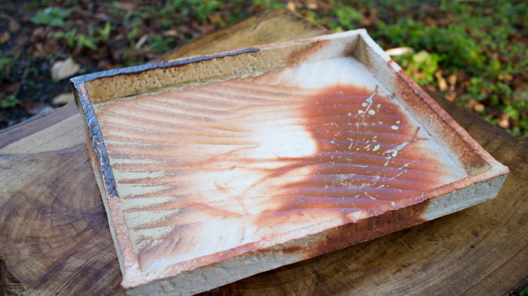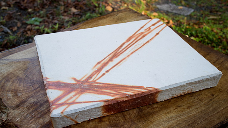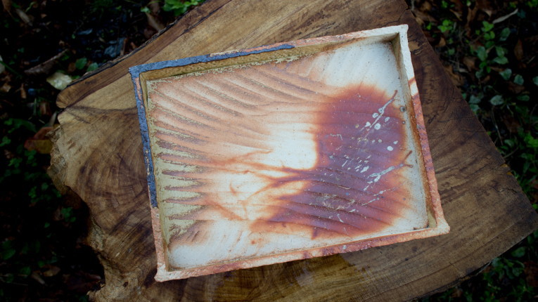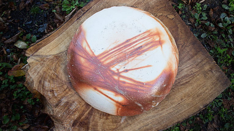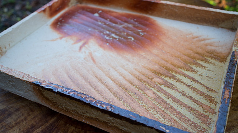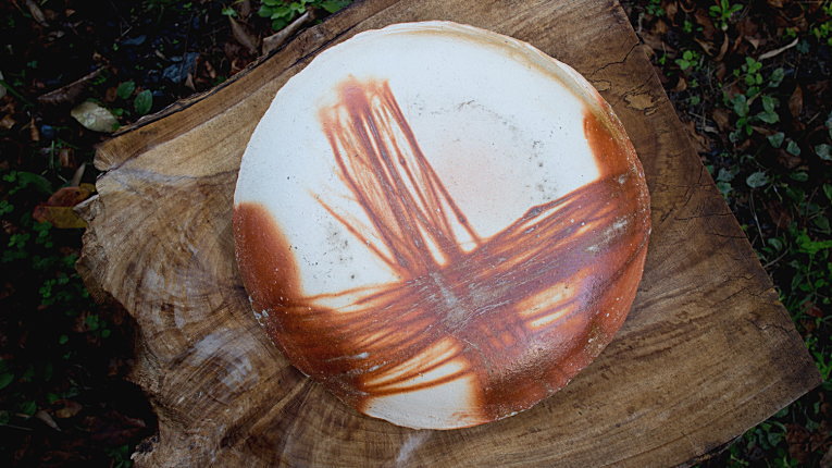 ハマグリの貝殻をぎゅぅと押し付けて模様を付けています。左上部は「松灰ビードロ釉」をスプレー掛けしています。