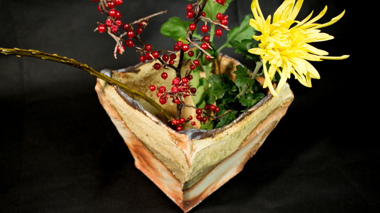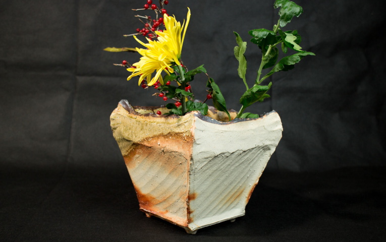 緋だすき窯変 古墳想い四方花器 Shihou Kaki